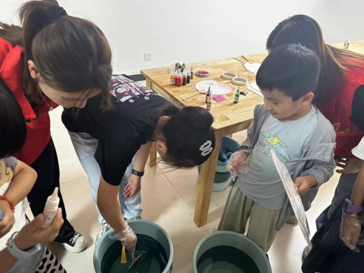 在家長的陪伴和指導(dǎo)下,孩子們挑選各自喜歡的扇形和顏色,將選好的大漆依次滴入清水中,將扇子緩慢旋轉(zhuǎn)直至全部浸入水中,一幅幅充滿個(gè)性的作品逐漸顯現(xiàn)。在制作過程中,親子們互相交流、學(xué)習(xí),共同感受著傳統(tǒng)文化的魅力。