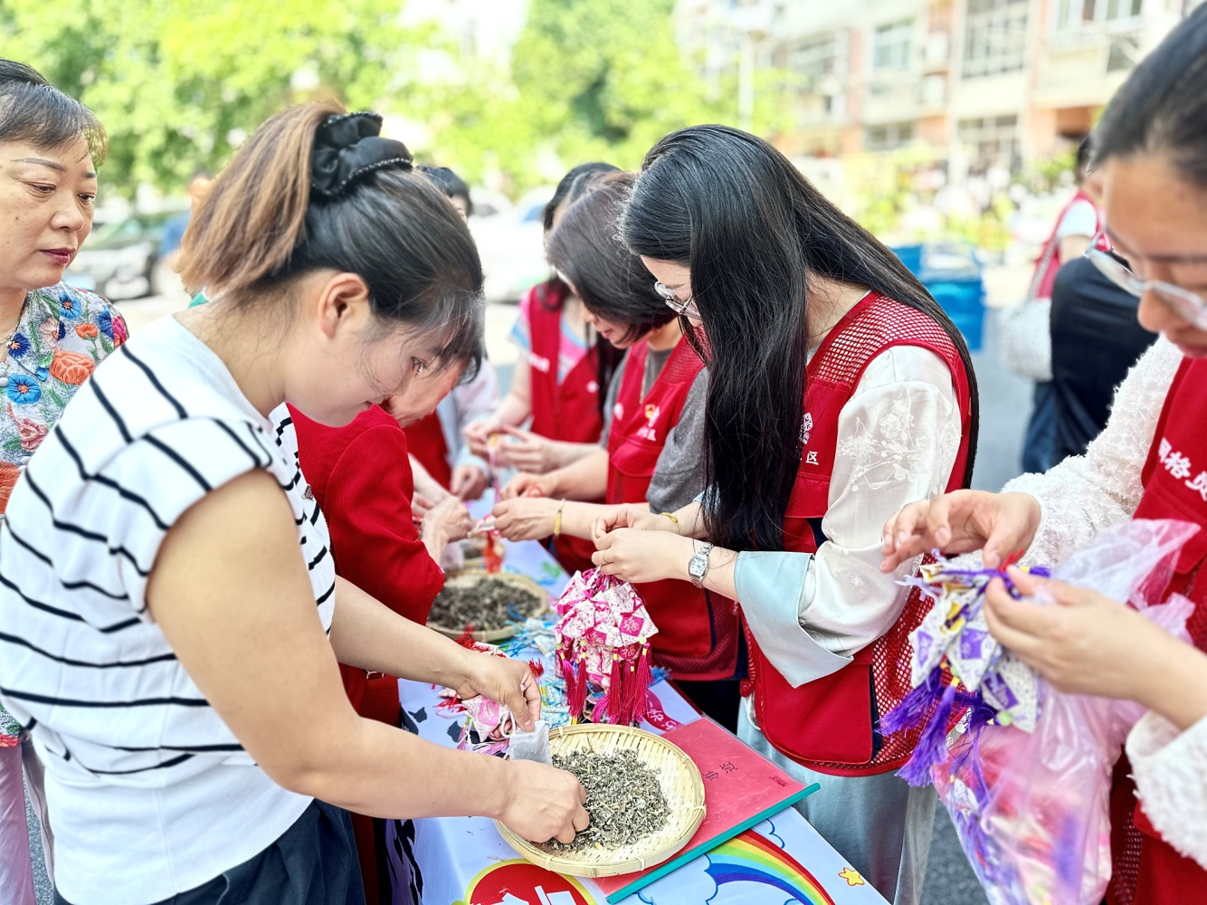 手工體驗端午香囊制作區(qū)同樣人氣爆棚。社區(qū)工作人員和志愿者們提前準(zhǔn)備好了制作香囊、五彩繩等端午手工藝品的材料,并耐心地指導(dǎo)居民們學(xué)習(xí)制作香囊,體驗端午民俗的樂趣。大家圍在一起,一邊交流著端午節(jié)的習(xí)俗和故事,一邊精心制作。不一會兒,一個個色彩斑斕、香氣撲鼻的香囊就在居民們的手中誕生了。居民們紛紛表示,通過親手制作這些傳統(tǒng)手工藝品,不僅感受到了傳統(tǒng)文化的獨特魅力,還增進了鄰里之間的感情。