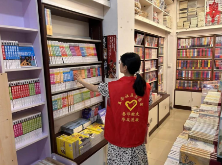 在巡查行動中,社區(qū)網(wǎng)格員重點檢查書店內(nèi)是否銷售含有淫穢色情、暴力恐怖、封建迷信等內(nèi)容的非法出版物,是否存在銷售侵權(quán)盜版重大題材圖書、暢銷書、非法少兒讀物的非法行為。巡查過程中暫未發(fā)現(xiàn)非法情況,與此同時還向經(jīng)營業(yè)主宣傳講解“掃黃打非”相關(guān)政策知識,傳播文明經(jīng)營、守法經(jīng)營理念,不斷提高廣大群眾“掃黃打非”的自覺性。